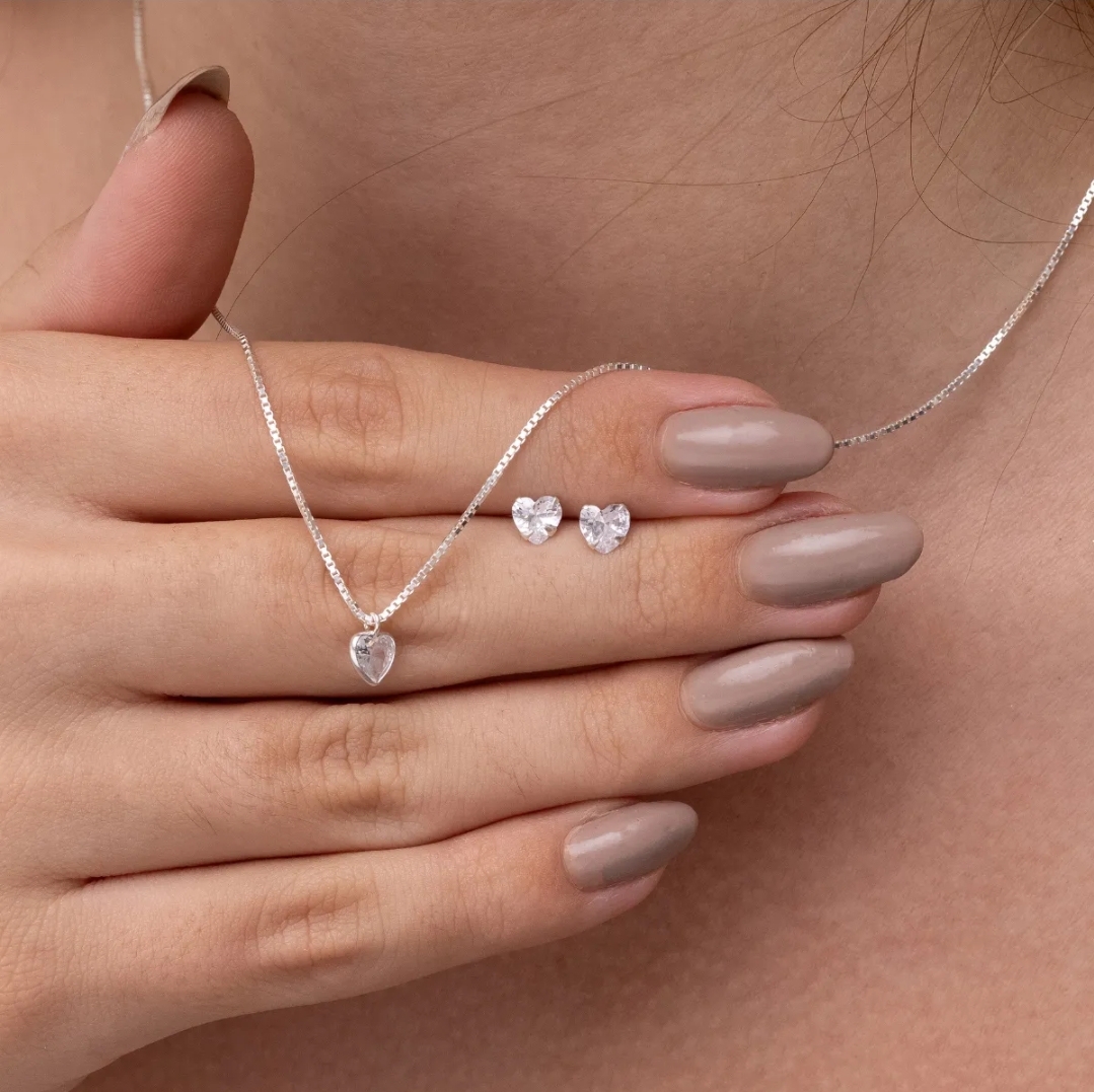 Conjuntos colar e brincos ponto de luz coracao prata legítima 925.