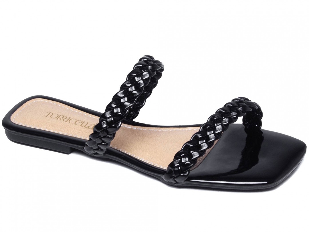 Material: Verniz Preto; Enfeite: Tiras trançadas em Verniz Preto; Palmilha: 4 mm de Espessura, Espuma em EVA, Revestida em Verniz Preto; Solado em PVC Flexível com antiderrapante e na cor Preto.